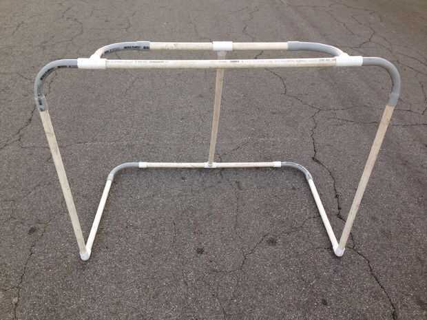 tienen un montón de palos de hockey usado de las calles?Corte cada palillo 8" más corto que el otro.Tornillo o cinta adhesiva junto (varían los ángulos) y Monte el conjunto en una base.Listo.Estante de la capa.