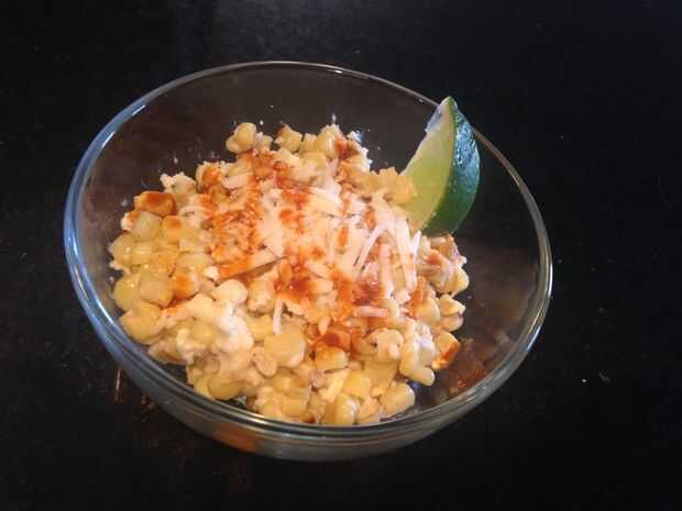 Después de unos minutos de mezclar el maíz, el queso y la crema de calor, retire y plato. Los últimos toques están la cal, pizca de polvo de Chile y luego la salsa caliente.