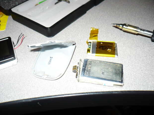 la batería de Samsung A660 tenía puesta alrededor era asombrosamente fácil de pop cuidadosamente, revelando la célula de iones de litio con su circuito de protección., un cheque simple con un multímetro me ralentizado que de los 3 pernos fueron positivos o negativos. Decidí dejar los circuitos de protección solo, iba para intercambiarlos, pero decidió que los fabricantes de la batería probablemente diseñado el circuito a la batería