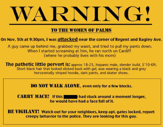 Informar al barrio. Disminuir las posibilidades de que esto sucederá a alguien más. En los días siguientes mi ataque, hice volantes con su descripción y había Publicada en los alrededores. No he podido resistir poner snark un poco en la mía, pensando en mi atacante fue del barrio y podría verlo. Gente de barrio habían apreciado las cabezas para arriba ya que nunca lo habría esperado en nuestra área. Si tu comunidad tiene una cartelera en línea, considere publicar la información allí también.