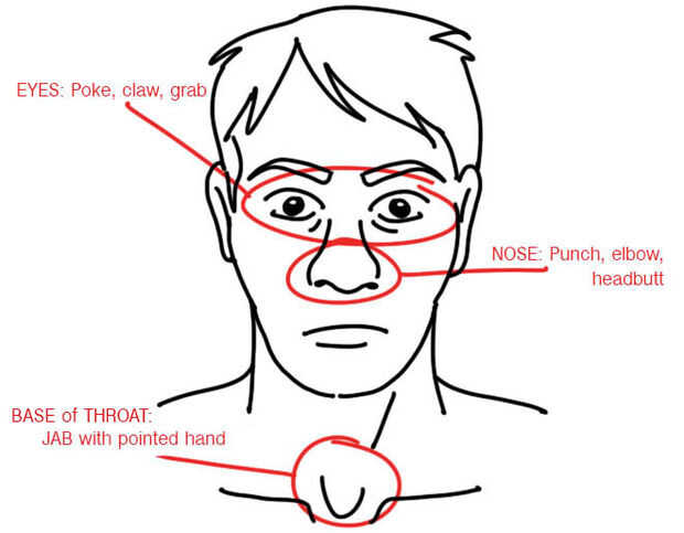 Ojos-- Gnarl los dedos en una mano en garra. Agarrar, desgarro y asoman a los ojos del agresor. Va a querer tener en tus manos lejos de su cara y tendrá que aflojar su empuñadura o ajustar su dominio para hacerlo. Esto es cuando se rompen y ejecutar.