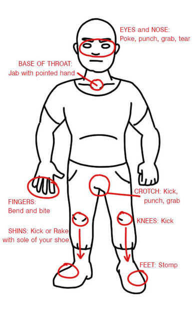 No tienes que ser un experto para frustrar un ataque de artes marciales. El agresor tiene una serie de puntos débiles que usted puede aprovechar rápida. Utilice cualquiera o todas de estas si agarro. Mi instructor de defensa personal puso a mí de esta manera: donde están causando malestar, que es donde va la mente de su atacante. Quiere su mente fuera de su control sobre usted. Dibujar su atención a otros lugares aumenta sus posibilidades de romper su agarre. El objetivo es interrumpir el ataque por lo que se puede romper libre y funcionamiento.