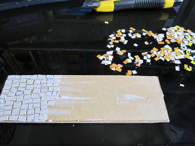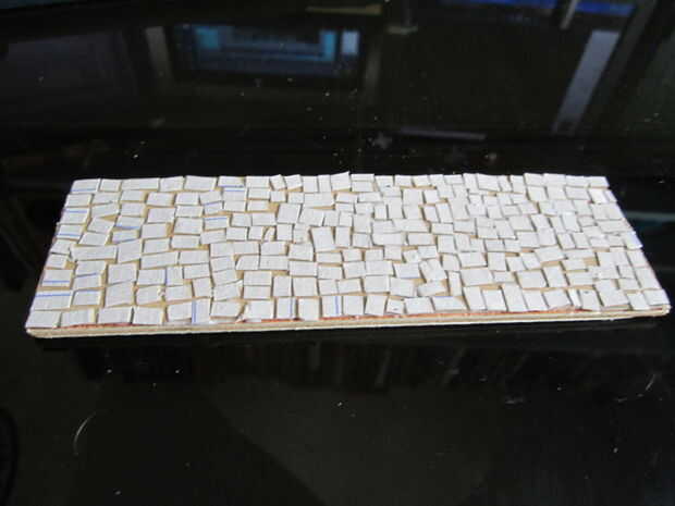 Así que en vez, usé una tarjeta más fina y cortar en tiras y cuadrados y pegado a la madera. Más calles empedradas que he visto no son uniformes, tamaños al azar de la tarjeta de adoquines parecen ser el mejor camino a seguir.