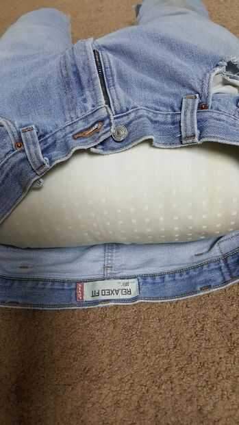 ¿Ahora recuerdo almohadas extra que no retire el relleno de? Va justo en la parte superior para crear la cintura de los pantalones vaqueros. Doblar por la mitad y sólo cosas en allí. Pack abajo porque no desea el relleno todo si el perro consigue a sus chompers en él.