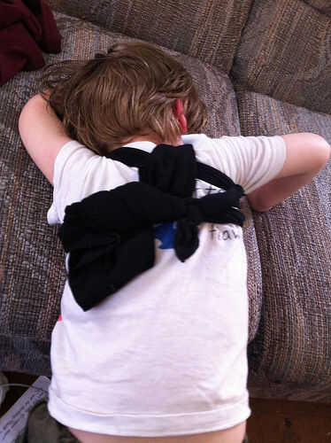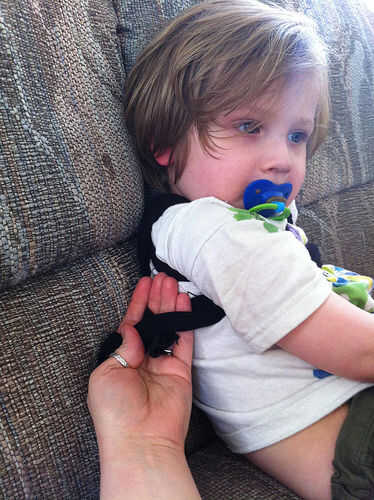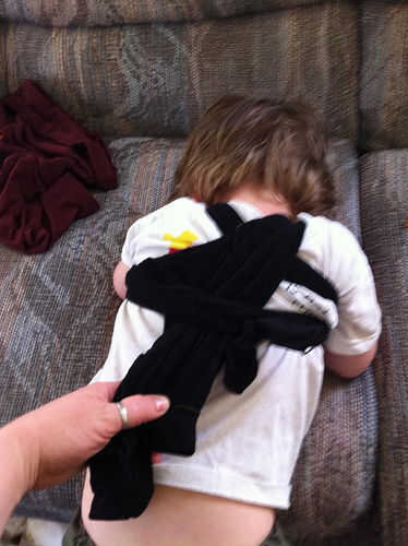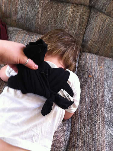 Tenga cuidado de no atar el nudo demasiado apretado. Usted querrá ser capaz de desatar fácilmente. Su niño probablemente le hará saber cuando lo quiere tratar de llevarlo a cabo o agarrar tu mano y poniendo en la envoltura. It'l ser difícil para el niño tener paciencia si tarda mucho tiempo en quitar.
