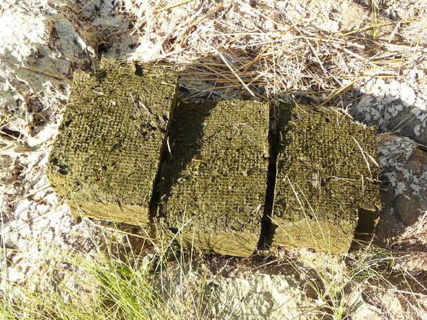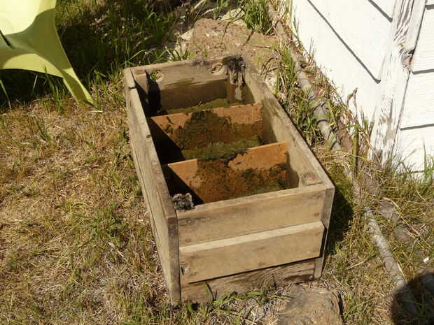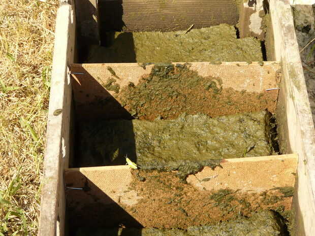 con la espuma de la charca. Además de utilizar en la compostera, estoy haciendo ladrillos para nuestra estufa de leña. Para hacer esto, hice un molde de ladrillo y llena de suciedad que sacado con pala fuera del estanque, ordeñar en el molde de madera, y deje que las algas secas en ladrillos ligeros.