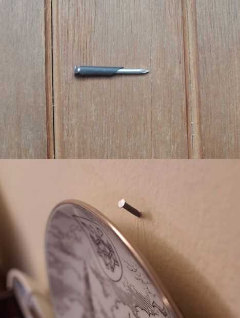 Rara vez utilizo anzuelos especiales colgado foto o placa. Tome el tubo estrecho y corte el largo clavo medio (hacer los 45 grado corte). Ponga el tubo en el clavo. Ahora usted puede estar seguro de que parte de la uña quedará mientras clavando.