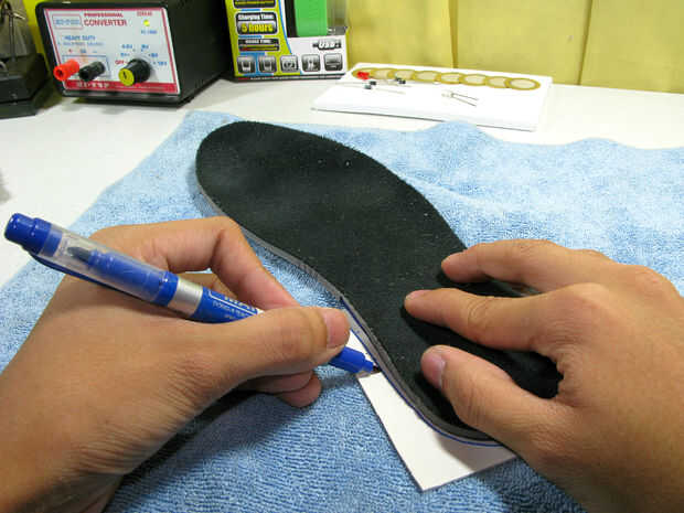 Obtener el tamaño y forma de la plantilla de su zapato y luego haz un par de esquileos resistentes tijeras de hojalatero y corte cuidadosamente el material del PVC. La placa actúa como el soporte principal de los discos piezoeléctricos / elementos.