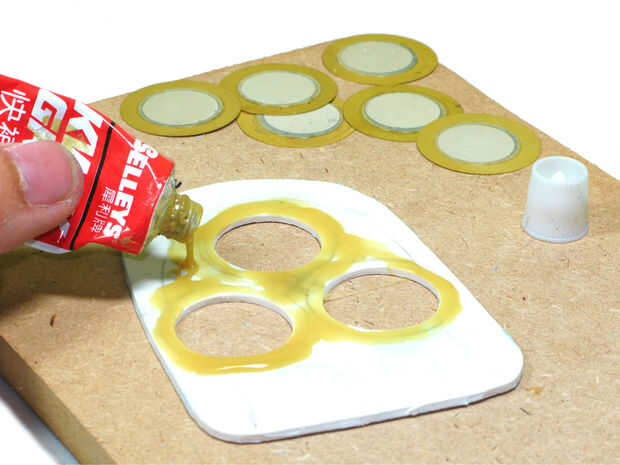 Estos discos piezoeléctricos tienen que soportar un montón de flexión ya que usted a caminar sobre ellos repetidamente! Nunca use superglue, si usted, el momento en que entras en su plantilla que los discos piezoeléctricos se encajarán a presión fuera de la almohadilla de PVC. En su lugar, utilice los ajuste rápido "adhesivos de contacto". Su característica elástica les hace el ideal para este proyecto ya que se estiran cuando están dobladas.