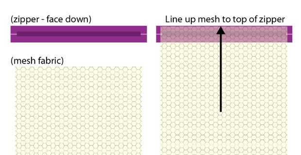 4. Coser el borde superior de la cremallera, asegurar la malla a la tela de la cremallera.