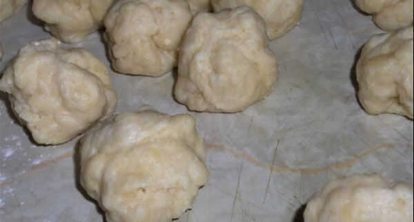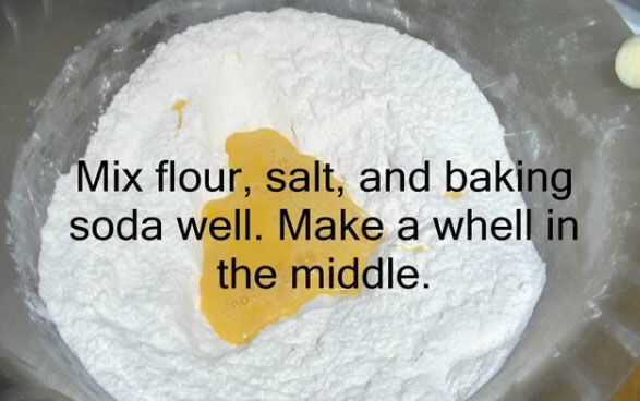 Mezclar bien harina, la sal y el bicarbonato de sodio. Haga un pozo en el medio. Derretir la margarina y mezclar con el huevo. Verter en el pozo junto con agua. Mezcla bien hasta hacer masa y no pegajosa a las manos.