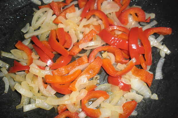 Saltear la cebolla y pimiento (o setas si quieres) con un poco de aceite hasta que la cebolla esté translúcida.