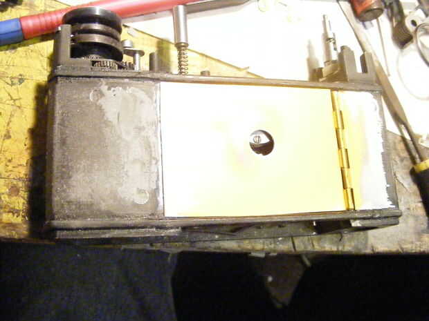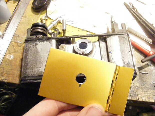 hizo una placa para el frente, entonces decidido quizás quiera utilizar el filtro en otra cosa en algún momento, o utilizar la cámara como una cámara estenopeica regular. así que una lata con bisagras fue adaptada para utilizar como puerta, tuvo un cierre magnético que usaba.