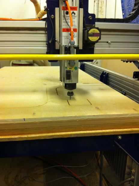 Corte los orificios con el 1/8" bit y corte el resto con el 1/4" bits. Los molinos de la CNC en Techshop no tienen cambiadores de herramienta por lo que tendrás que hacerlo manualmente (ugh). Esto significa, por cada hoja, ejecución 1 trabajo con los 'huecos', entonces cambiar la broca, volver a poner a cero el eje Z y luego ejecutar otro trabajo con todas las otras trayectorias de herramienta. Probablemente tardará por lo menos (2) sesiones de 4 horas en el ShopBot.