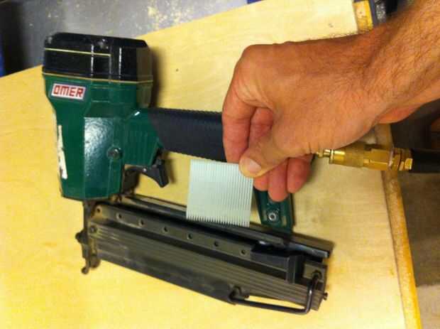 Utilice a la clavadora para fijar la madera a la cama de corte de la CNC. Las uñas de plástico (disponibles en la recepción del Techshop) no lastimarán sus fresas. Es muy importante poner un brad en cada esquina y unos pocos en el campo. Algunas de nuestras piezas toman más de una hoja y es trágico cuando su hoja se queda en la máquina, pero su pieza y vuela al suelo. Uñas de plástico arena abajo al ras con la superficie y hacerse casi invisibles en el material de acabado.