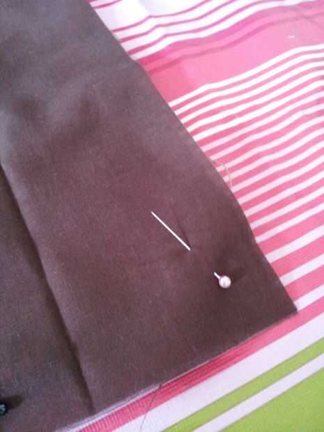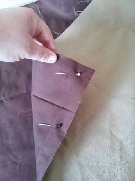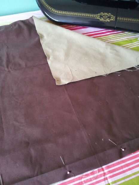 Poner a las 2 telas derecho contra derecho tocando. Perno de la parte superior e inferior pedazos juntos solamente en los lados largos.