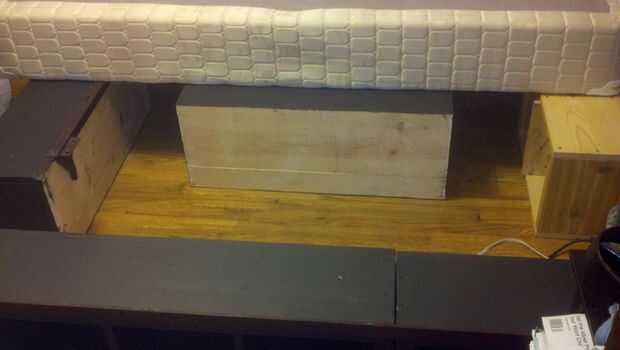 Luego coloqué las cajas en el dormitorio donde sea necesario. Utilizando las piezas del marco con patas de quita, colocaba en los bordes exteriores de las cajas. Fijar estas piezas las cajas usando tornillos de madera y los agujeros ya en marco. Si es necesario se podrían perforar nuevos.