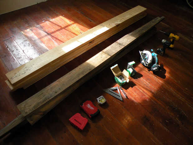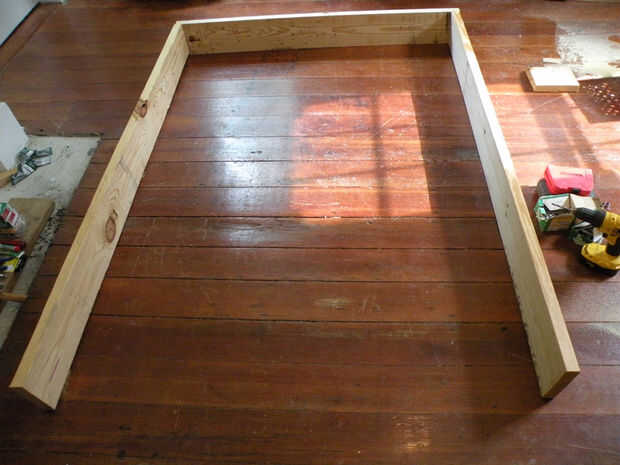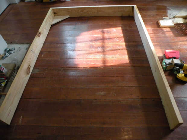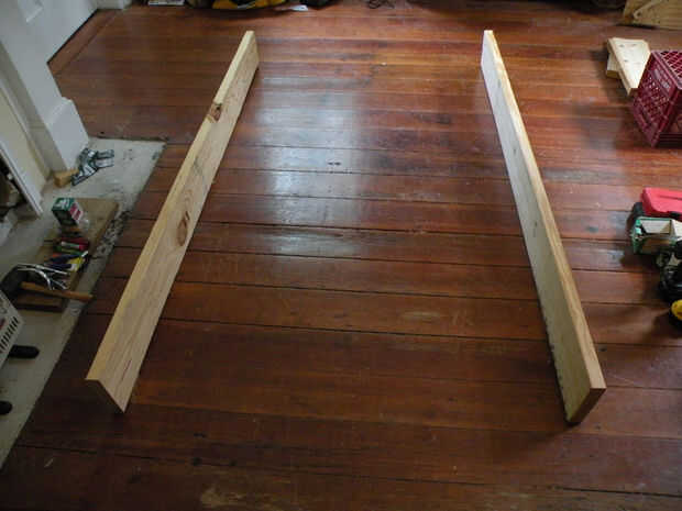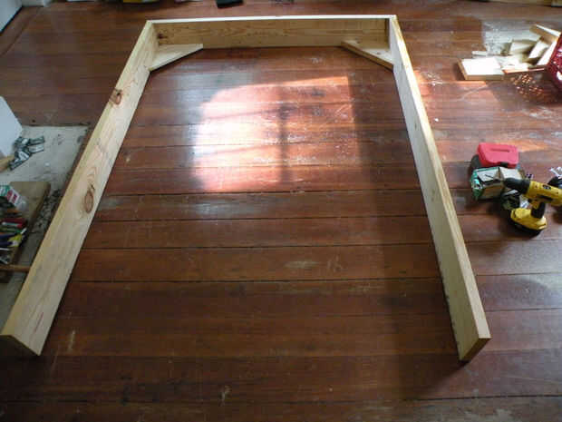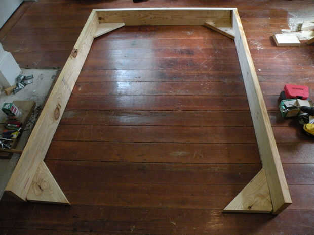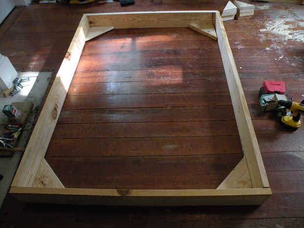 Para reforzar las esquinas y crear un lugar para las piernas sujetar, puse un refuerzo en cada esquina que se hizo de uno de los trozos sobrantes de 2 "x 8". Sólo se cortan el triángulo rectángulo más grande que usted puede hacia fuera del material. Hacer cuatro de aquellos.