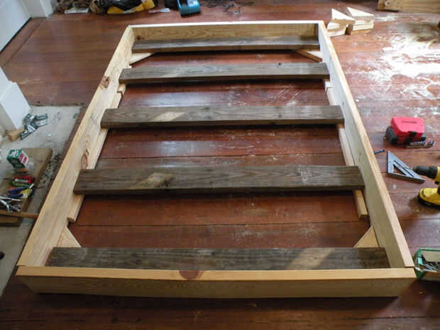 Enroscar y pegar a la parte inferior dentro de los lados largos del marco de la creación de los corredores que los listones se reclinará sobre. Utilice tornillos de drywall que no asoman a través hacia el exterior--2-1/2" largo son perfecto. Asegúrese de que estos son seguros, toman la mayor parte del peso del colchón y sus ocupantes.