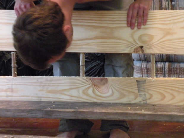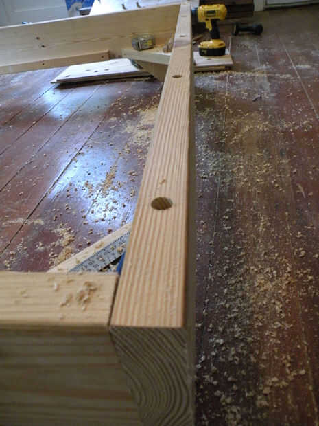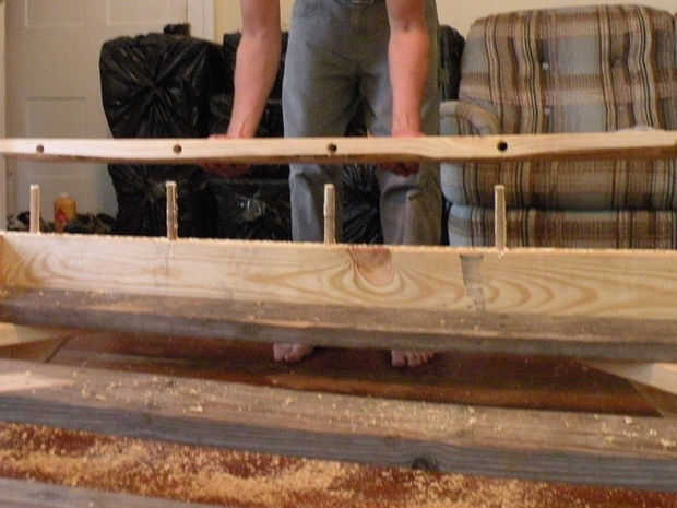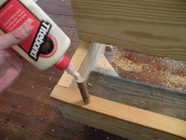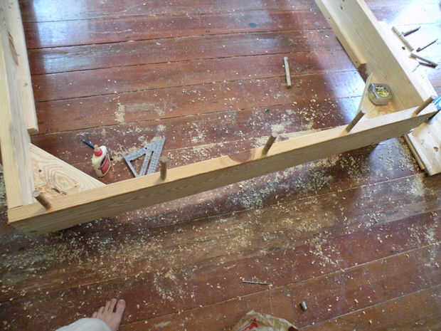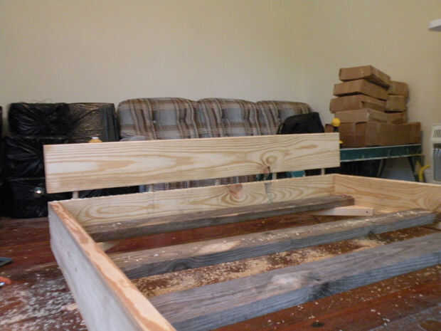 Mantenga su cabecera hasta las clavijas y escriba líneas a través de para que alinee, taladro, martillan y pegamento abajo. Obviamente, había equivocado un poco el grosor del colchón y el cabecero no se pega mucho. No importa si tienes tu cama contra la pared. Si usted quiere una cabecera más grande, sólo alargar sus clavijas y palmada una 2 "x 10" o 12" allí o dos 2" x 8 "s.