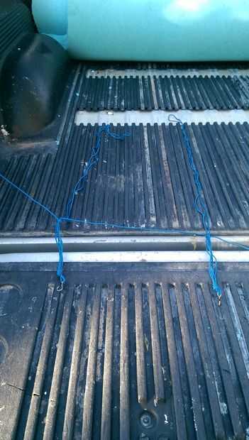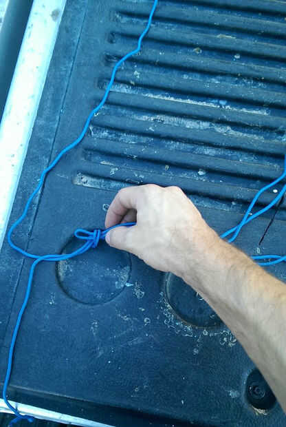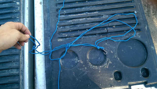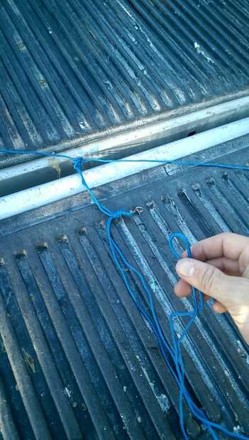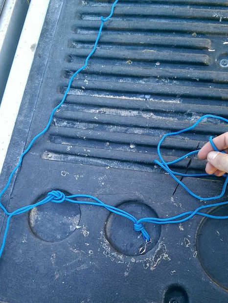 atado un lazo en el extremo inicial. hacer un nudo de lazo en aproximadamente 1ft desde el nudo inicial. hecho este bucle 4 pies en longitud a partir del nudo hacia la punta. colocar un gancho a través y atado que de alrededor de 6 pulgadas desde el nudo y tirar el resto de la cuerda a través de dicho nudo. repite este dos veces más para tener tres seguros en total.