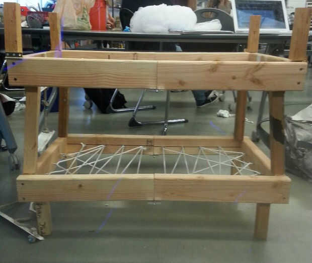 Terminar de revelar todo y apilarlo todo! Las piernas deben ser capaces de descansar en el bastidor por debajo. No puede ser muy robustos (nuestro prototipo definitivamente no estaba) pero debe apilar independientemente. El toque final es cubrir el mosquitero sobre él! Ahora la red que era bastante grande así que si usted está haciendo la escala mitad le sugiere cortar la red para adaptarse a la cama [finales dimensiones son ~ 2,5' alto, 3' largo y 1.5' de ancho] que también tenga que cortar algunos para una escala [dimensiones aproximadas son 4.5' de alto, 6' y 3' de ancho]