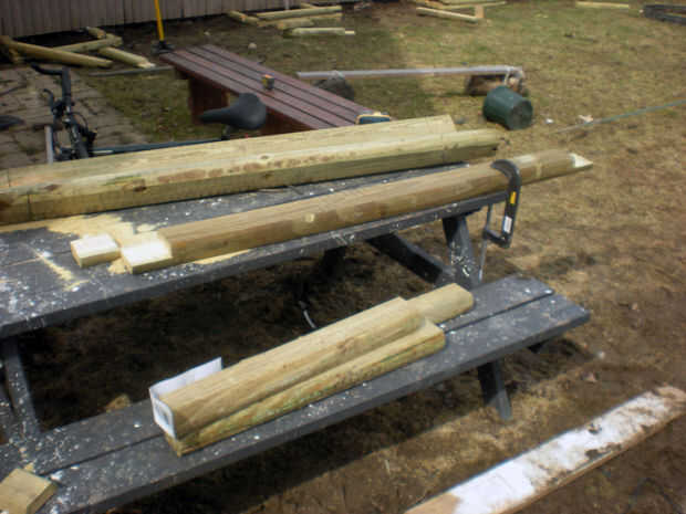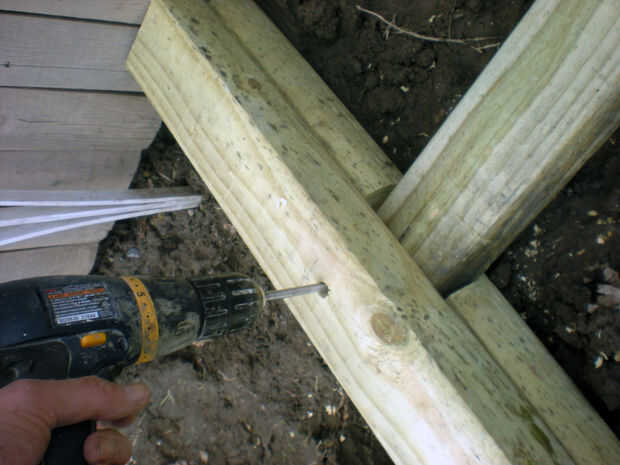 Corte los registros de 8' a la longitud adecuada y la muesca o extremo como antes. Vuelva a colocar las piezas superiores en lugar y utilizar el orificio existente como guía para perforar a través de los extremos. Conjunto todo de nuevo, inserte la varilla y un martillo al ras con los registros.