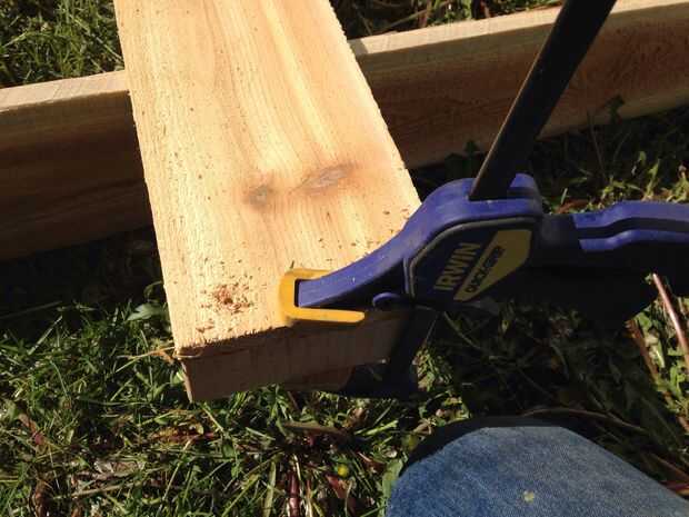 Ahora sujete una Junta de esquina en cada extremo de los 6' piezas, perfore previamente y luego atornille el tablero de la cerca a la Junta de esquina.