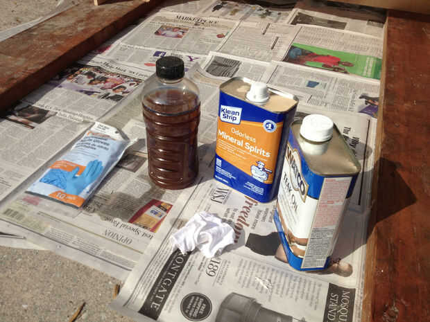 Madera contrachapada tiende a ser bastante denso y no acepta acabados. El pegamento alto contenidas y finas carillas mantienen de ser muy absorbentes. En un intento de oscurecer la madera un poco y sacar el grano, usé una mezcla de aceite de teca de 80% y 20% de diluyente para el subpelo. El diluyente ayuda a entrar en el grano más denso. Frote el aceite en la madera con un trapo limpio y sin pelusa, deje reposar quince minutos y pulir cualquier exceso con otro paño.