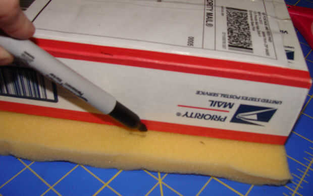 Cortar su espuma suave de la célula el tamaño de su caja.  Tuve que dividir mina con tijeras porque es demasiado gruesa.  Esto es fácil de hacer cortando justo por la mitad con tijeras a través de todo el camino.  Tuve que pegar mis dos piezas con pegamento para tela.  Estoy seguro de que el pegamento de espuma trabajaría demasiado.