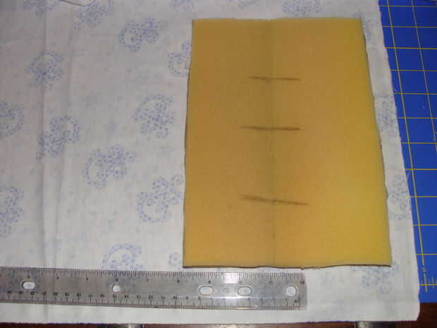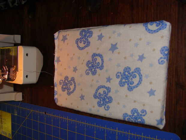 Luego dobla el material por la mitad y girar parte del material grabado. Coser el lado de la funda. Lo hice con la pieza de espuma dentro por lo que podría asegurar que fue ajustado. No coser a la espuma. Luego retirar la espuma y cosido abajo del borde superior. Ahora gire el material derecho hacia fuera y coloque la pieza de espuma de vuelta dentro. Recortar los bordes según sea necesario, dejando aproximadamente 1/4 de pulgada. Coser la tapa cerrada. He tirado el material hacia abajo y cosido en el borde inferior para que no mostraría la puntada final en la parte superior del colchón.