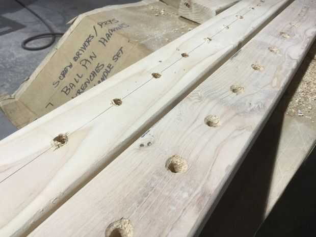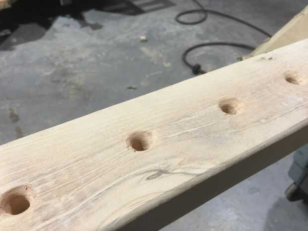 Medir el centro de los largueros y Marque a lo largo de toda su longitud. Luego, haga una marca cada 3". Ahora perfore un agujero lo suficientemente grande como para la cuerda empujar a través relativamente fácilmente en cada marca en ambos largueros. (Nota: el espaciado de los agujeros será directamente correlativo a cuánta cuerda necesitará la cama, la diferencia de 1 pulgada de encaje puede ser tanto como 20' de la cuerda) Finalmente estrechar los agujeros para reducir la abrasión que experimenta la cuerda. Recomiendo conseguir una herramienta hecha especialmente para este trabajo. He intentado improvisar y estaba decepcionado con los resultados. Afortunadamente, en su mayoría se ocultan en el proyecto final.