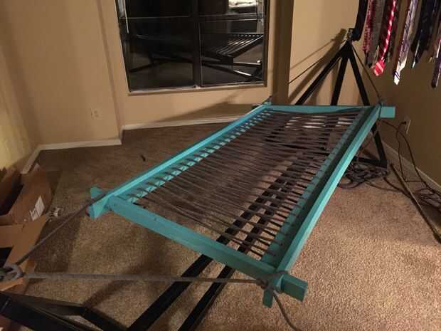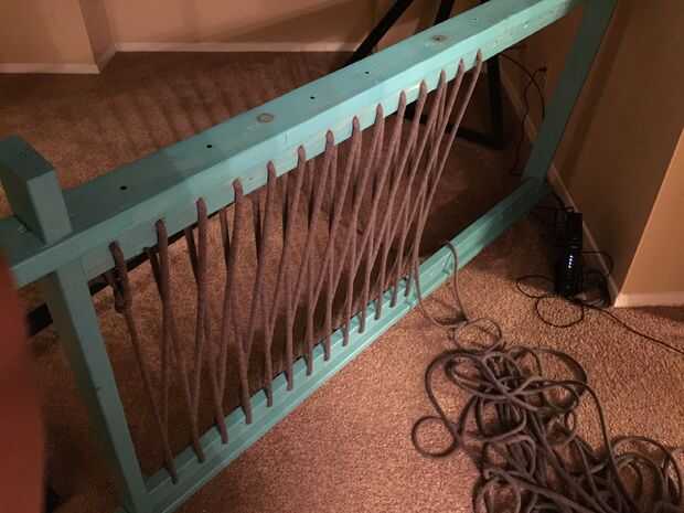 A continuación, viene la rutina, tirar aproximadamente 12 billones pies de cuerda a través de pequeños orificios en un marco de madera inestable. Empezar por atar un extremo con el primer agujero en el larguero y el encaje para arriba como un par de zapatos, o botas, patines, o sandalias o corsé, lo que es más fácil imaginar. Uno podría de encaje en un patrón espiral pero decidí hacer un ocho mediante la introducción de la parte superior en ambos largueros. A cada su propio.