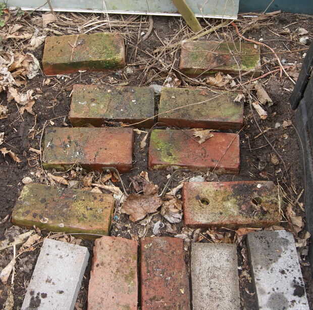 Tenía los ladrillos en mano, así que había utilizado. Les tengo desde una chimenea de rasgado-abajo sentados por un tiempo, por lo tanto la edad ver. Poner ladrillos en el centro para apoyar mi cubo de drenaje (utilizar esa agua para otras plantas en macetas) y extras pote del almacenaje. Más ladrillos en la parte delantera preven un espacio libre de fango de pie al hacer el trabajo en la parcela de lechuga.