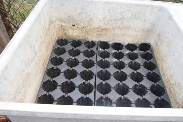 Tuve algunas células plantación con una tapa plana y conos debajo que terminó en los agujeros. Recortado dos de ellos para caber en la parte inferior de la tina.