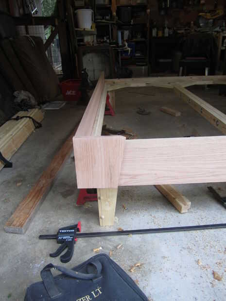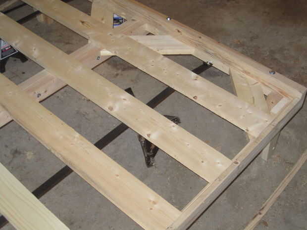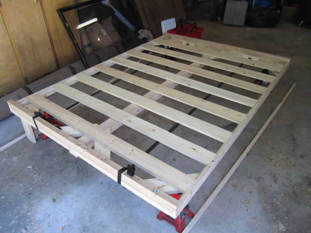 Puedes ver la idea básica; construir dos mitades que son 31 "x 85", las tres pulgadas extras hacer espacio para las llaves en la cabeza y del pie para reducir hundimiento después de las dos mitades están atornilladas entre sí. Los listones se sientan flojo en el marco y están conectados entre sí con una correa de nylon con grapas a la parte inferior por lo que pueden ser enrolladas y se movió como una.