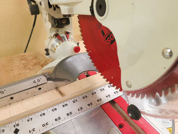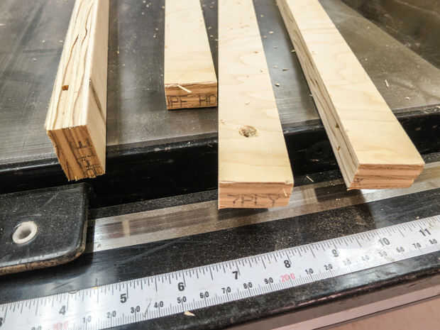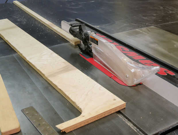 La forma más sencilla de cortar estas es en la Sierra de mesa. Corte cinco 1.5" tiras que son 48" largo (el ancho de la madera contrachapada). Luego se corta tres de éstos por la mitad. Esto le da dos 48" piezas y seis 24" piezas.