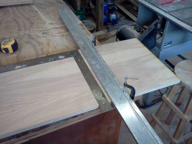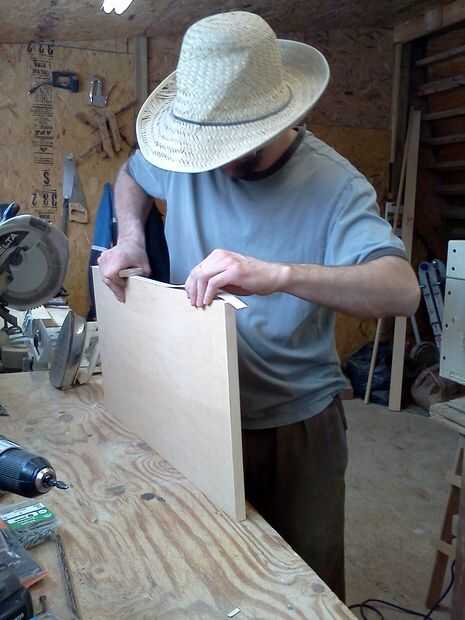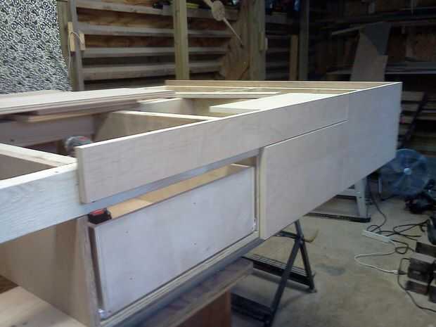 Arrancaron la madera a un ancho de 14-1/2" en la Sierra de mesa. Entonces yo cortar las piezas a la longitud. Sujeta un borde recto para la madera contrachapada para utilizar como guía de corte. Utilicé un cuadrado de carpinteros Alinee el borde recto y asegurar un corte perfectamente. Usé una sierra circular para hacer los cortes. El primer corto fue el panel lateral a los pies de la cama. Corte el tiempo suficiente para extenderse más allá de los pies de la cama por 3/4". Esto es para cubrir el borde lateral del frente del cajón, en el cajón a los pies de la cama. A continuación apliqué la chapa en los bordes. Temporalmente sujeta la Junta en su posición en el marco de la cama. Permití el borde superior del panel hacia arriba 1-1/2" por encima de la superficie de la cama para disimular la parte inferior del colchón cuando termine. Cuando estaba satisfecho con su posición, sujeta el panel en su lugar atornillándolo en el marco de la cama desde el interior. La pieza siguiente corto fue para los cajones de 2 lado. Lo corté en uno, 40" pieza, la longitud de ambos cajones combinados. Luego arrancó una tira de 4" de la cajón pieza, 40" de largo, para instalarse a lo largo del borde superior de la cama. He seguido el mismo proceso de recubrimiento, alineando, sujeción y fijación en su lugar. La pieza de madera contrachapada que queda después de la rip fue cortada por la mitad para formar los paneles frontales de cajón de 2 lado. Con las cajas del cajón instaladas en lugar de las diapositivas del cajón, coloca los frentes de cajón en lugar. los frentes de cajón extienden aproximadamente 5/8" por debajo de la superficie inferior de la cama para permitir que un lugar abrir el cajón con el uso de hardware de tirar del cajón. Usé 1/8" palos gruesos separador, colocados entre los bordes superiores y laterales del panel frontal del cajón, para mantener el espacio vacío hasta. También mencionaré que pre-perforados los agujeros en el marco de la cama donde se instalaron los tornillos de fijación del panel. Esto disminuye la posibilidad de que los paneles cambiando mientras que los tornillos están siendo desplazados. Continué aplicando los paneles de acabado de esta manera en los otros 2 lados de la cama.