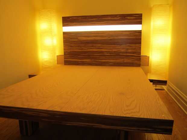 Tiene mesitas de noche que se incorporaron en la cama de plataforma. Pensamos que eran cool y podríamos hacerlos retráctil. Probablemente no soportan tanto peso, pero te tienen una computadora, libro, vaso de agua, 20 o 30 libras que creo. La cama es hecha de 2 x 4, 2 x 6 y madera contrachapada de 3/4 y entonces cubierta de roble y el bambú.