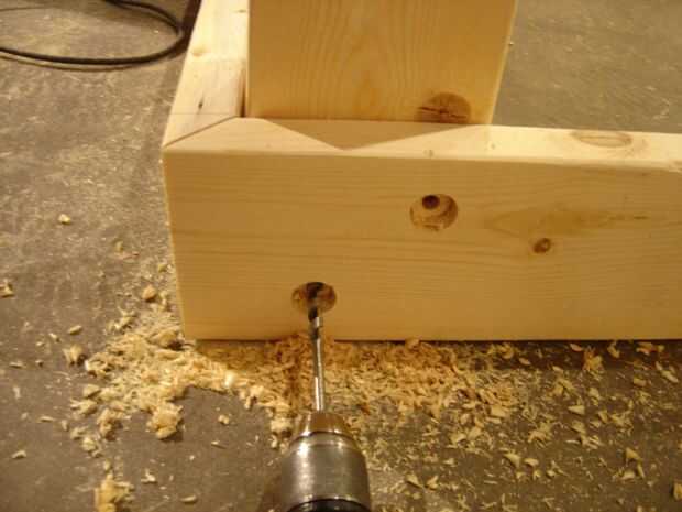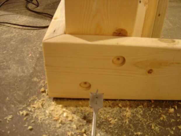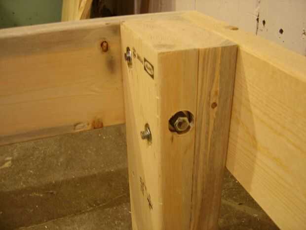 Usé las tuercas y pernos largos porque usted puede realmente la manivela les firmemente para evitar que la cama que años. Perforé el agujero de la pala de 3/4 primero sobre una pulgada de profundidad, luego un 3/8 agujero completamente a través. Esto es así puede avellanar la cabeza del perno. Utilice enchufes para apretar.