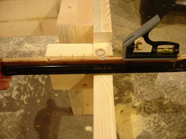 Con los bloques de apoyo en lugar, ahora puede montar las diapositivas exteriores. Como se indica en la imagen, use un cuadrado y un nivel. Obviamente no desea que la tabla de desplazamiento o por sí mismo o conseguir flojo o apretado como se abre ya que las diapositivas no son paralelas.