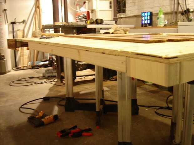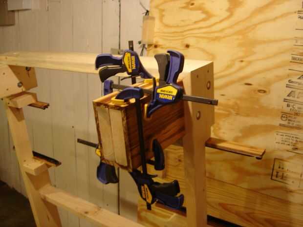Por último, se cubren las piernas. Esto es un poco complicado porque para hacer las juntas a inglete se ven bien, creo que tienes que hacer todos los lados al mismo tiempo para poder hacer los pequeños ajustes para afinar hasta las esquinas. Do un funcionamiento en seco con pinzas primero averiguar qué piezas iría donde mejor. Teóricamente, todos serían idénticas, pero obviamente sabemos que este no es el caso, así que creo que usted puede encontrar un acuerdo que funciona mejor antes de aplicar el pegamento. Utilicé la madera pegamento otra vez y un montón de pinzas. Ser paciente. Deje que se seque durante la noche antes de pasar al siguiente. Este pegamento es para mentir sobre el piso, así que si no está totalmente seco y colgando verticalmente, la pieza se comba.