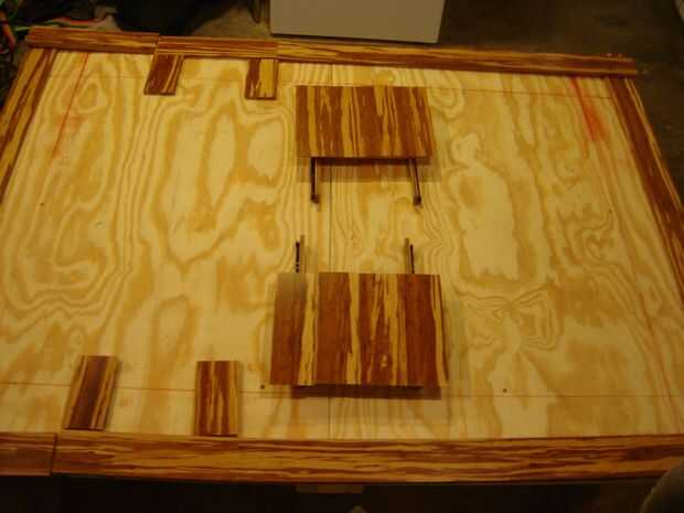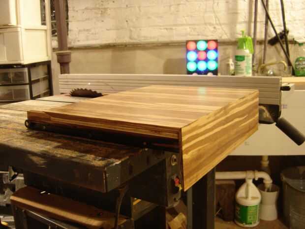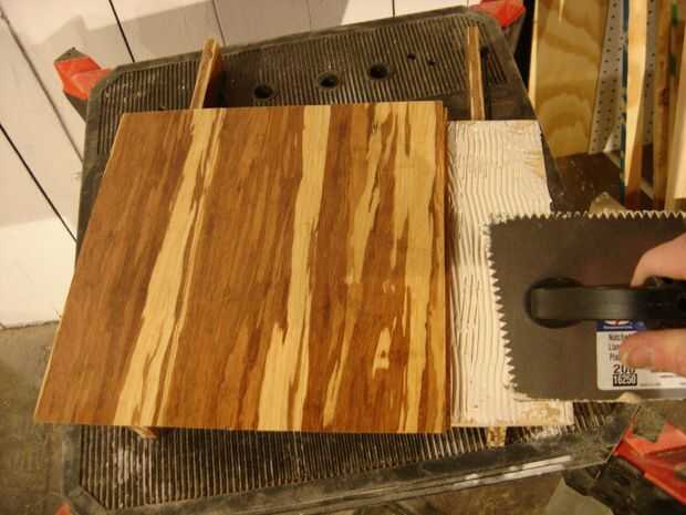 Es el momento para cubrir las mesas deslizantes de bambú. Utilizar una llana dentada y haz un bonito patrón acanalado para proporcionar buena adherencia. Tienes que trabajar algo rápidamente, ya que se inicia la curación en tal vez diez minutos o así. Una vez que la parte superior hecha, poner mucho peso en ella y deje que se seque durante la noche. Usé pegamento gorila otra vez para los lados porque hay tan poca superficie.
