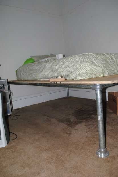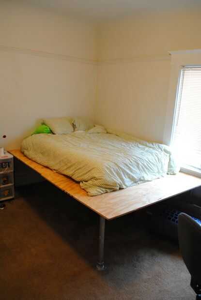 Remata todo con dos piezas de madera contrachapada. Actualmente, la cama mide 5 pies 7 pulgadas X 8 pies X 2 pies. La altura da un montón de almacenamiento pero creo que va para bajarlo pronto para hacer entrar en lo más fácil. Yo podría cortar el tubo más corto, debido al borde inútil que actualmente actúa como un almacén de ropa limpia. Con este tamaño de la cama, no sería difícil integrar un buen almacenamiento.