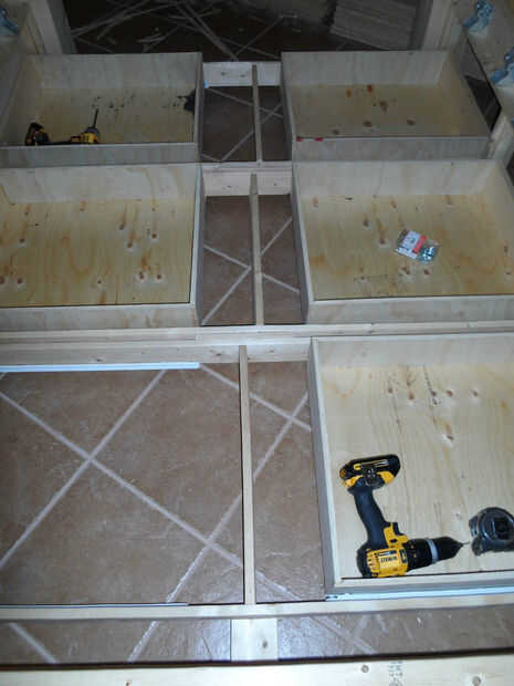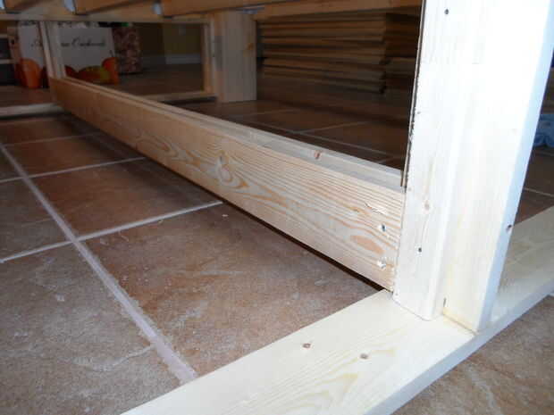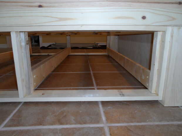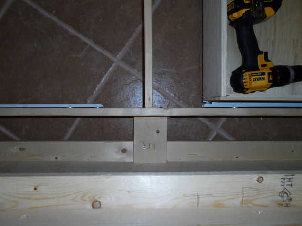 Para construir los marcos para montar las correderas en, uso 1x4s y adjuntarlas como las vigas de la parte posterior del tope a la parte posterior del tope de puerta de oposición. Asegúrese de dejar un espacio entre la parte inferior de la vigueta 1 x 4 y la parte inferior del marco frontal de cajón (ver imagen). Fije cada vigueta mutuamente con bloques para endurecer para arriba y hacer los espacios incluso.