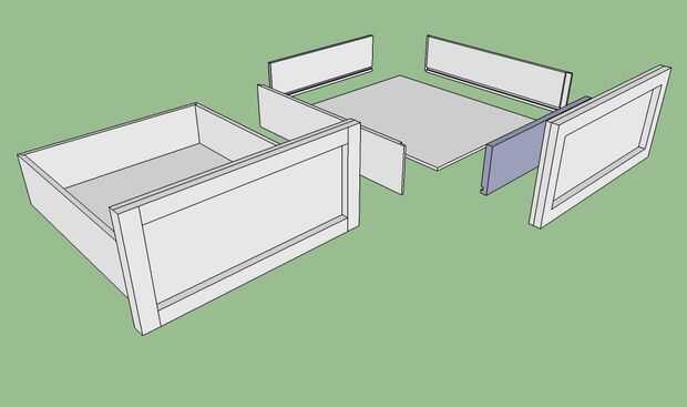 Ahora comienza la diversión! Usted puede construir sus cajones quieras, si utilizas las juntas a tope o galletas o rebajos o lo que sea. Usé las uniones ranuradas. Mirando las fotos le ayudará a entender lo que las piezas parecen mejor de lo que puedo explicarlos. Los lados del cajón y respaldos son capas de 1/2" y la pieza para la parte delantera que se sujeta al frente de la gaveta es de 1 x 6. La espalda y el frente del cajón sólo tienen mortajas (realmente llamado arados porque van con el grano) para el fondo del cajón que es capas de 3/8. Los lados de la gaveta tienen los extremos rebajada a la mitad su espesor para las otras piezas y mortajas. Corté todas las piezas en la Sierra de mesa. Los frentes de cajón terminado construidos y Unidos más adelante.