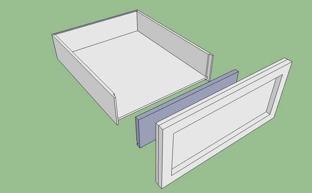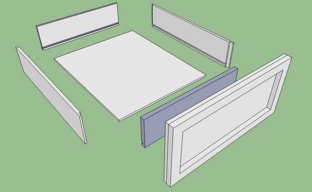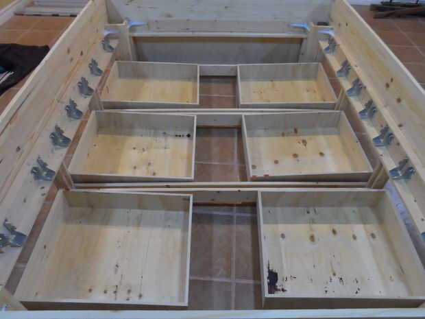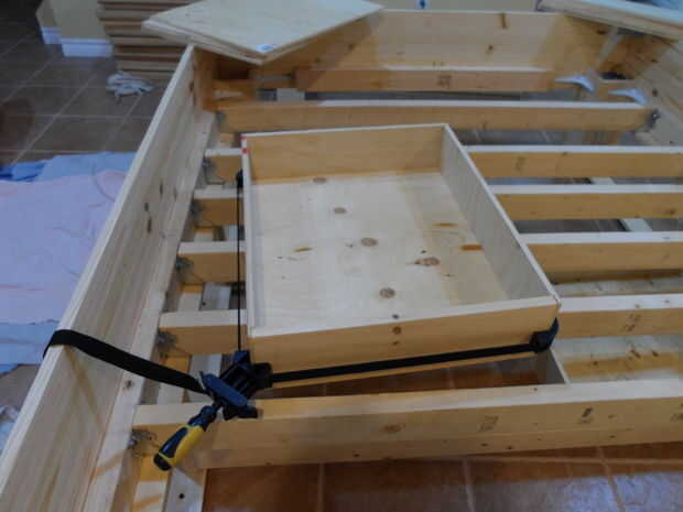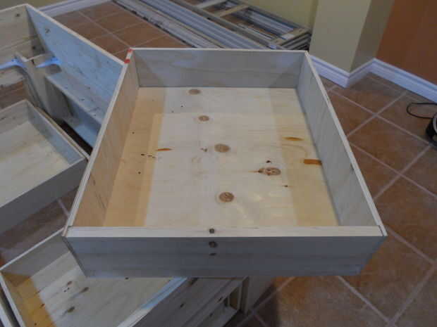 Para armar los cajones puso una cantidad generosa de pegamento en cada rebaje y dado. Luego inserte la parte inferior del cajón de madera en la ranura en la parte posterior del cajón, a continuación inserte los dos lados y los lados del clavo en la parte posterior del cajón. Usé 1" clavos de acabado liso como están sólo para celebrar juntos mientras el pegamento seca. A continuación fije el frente con el mismo método. Utilice la abrazadera del marco para unir las piezas del cajón mientras clavo las articulaciones. Quite la abrazadera del marco una vez que todas las uniones son clavadas. Esto puede ser un proceso muy desperdiciador de tiempo pero he conseguido completar seis cajones en aproximadamente una hora y media.