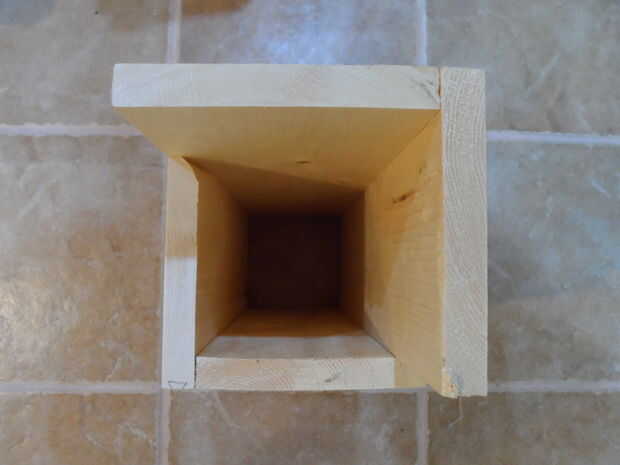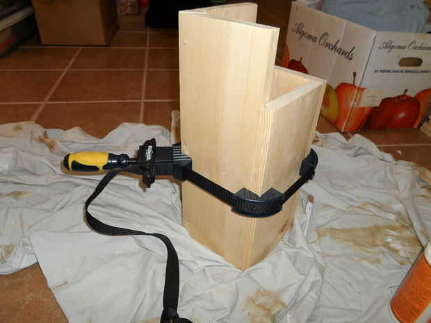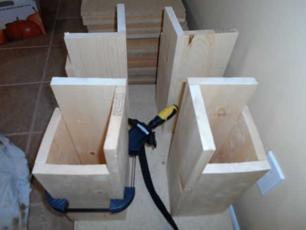 Para empezar a construir las piernas. Tomé de acabado 1 x 6 y corte 2 piezas de cada pata la altura quiero la parte inferior de los rieles en (fui con 12 pulgadas). Las otras dos piezas para cada pierna corto 3.5 pulgadas más largo (ancho de 2 x 4). Entenderás por qué en un paso posterior. Tomé estas piezas y pegado y clavó con clavos de acabado, colocar 2 piezas juntas en un momento en la forma de una L. Os adjunto a continuación dos de estos juntos para hacer un cuadrado. Esto es donde la abrazadera del marco práctica mantener todo cuadrado. Asegúrese de que las dos piezas más largas son adyacentes y las dos piezas más cortas son adyacentes. habrá un exceso de madera en una de las piezas más largas que pueden quitarse mesa de sierra o sierra de mano. Esto es para permitir que el riel se apoye en las piezas más cortas.
