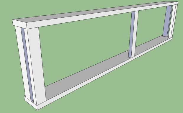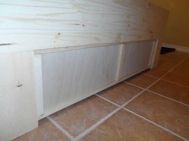 Para construir los frentes de cajón falso a los pies de la cama, construí un marco usando 1 x 4 y 1 x 2. Luego deslizó un pedazo de la madera frontal del cajón en el marco de la pieza central y las piezas laterales. A continuación os adjunto 1 x 2 a la madera contrachapada para imitar el aspecto de mis frentes de los cajones.