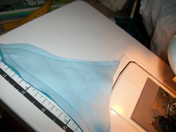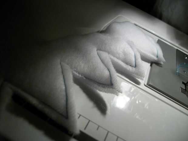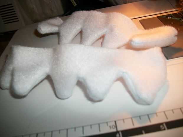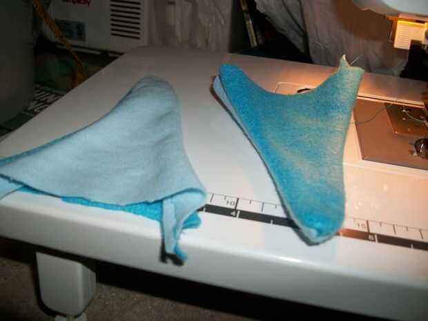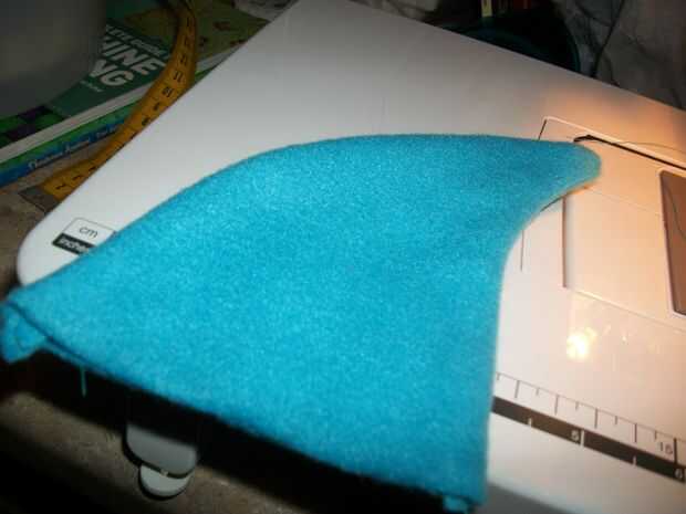 Cuando usted está listo para coser las aletas y los dientes Asegúrese de que todos los lados derecho son tocar/frente uno al otro. 2 piezas con el lado derecho uno frente al otro y coser alrededor de los bordes como se muestra en los cuadros dejando una abertura para que usted puede resultar ellos derecha. Si usted quiere que usted puede ligeramente estas cosas si quieres que estén hinchados.